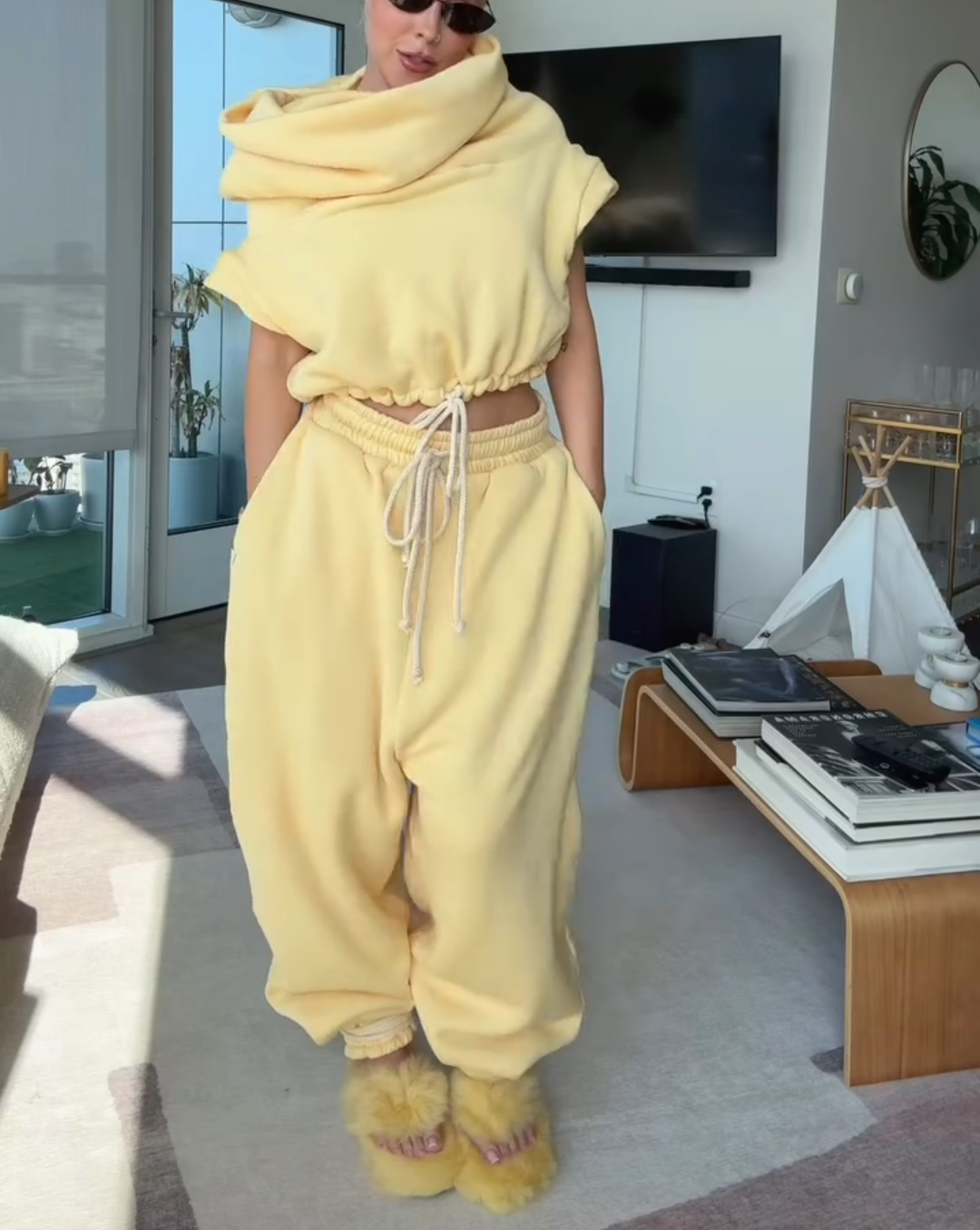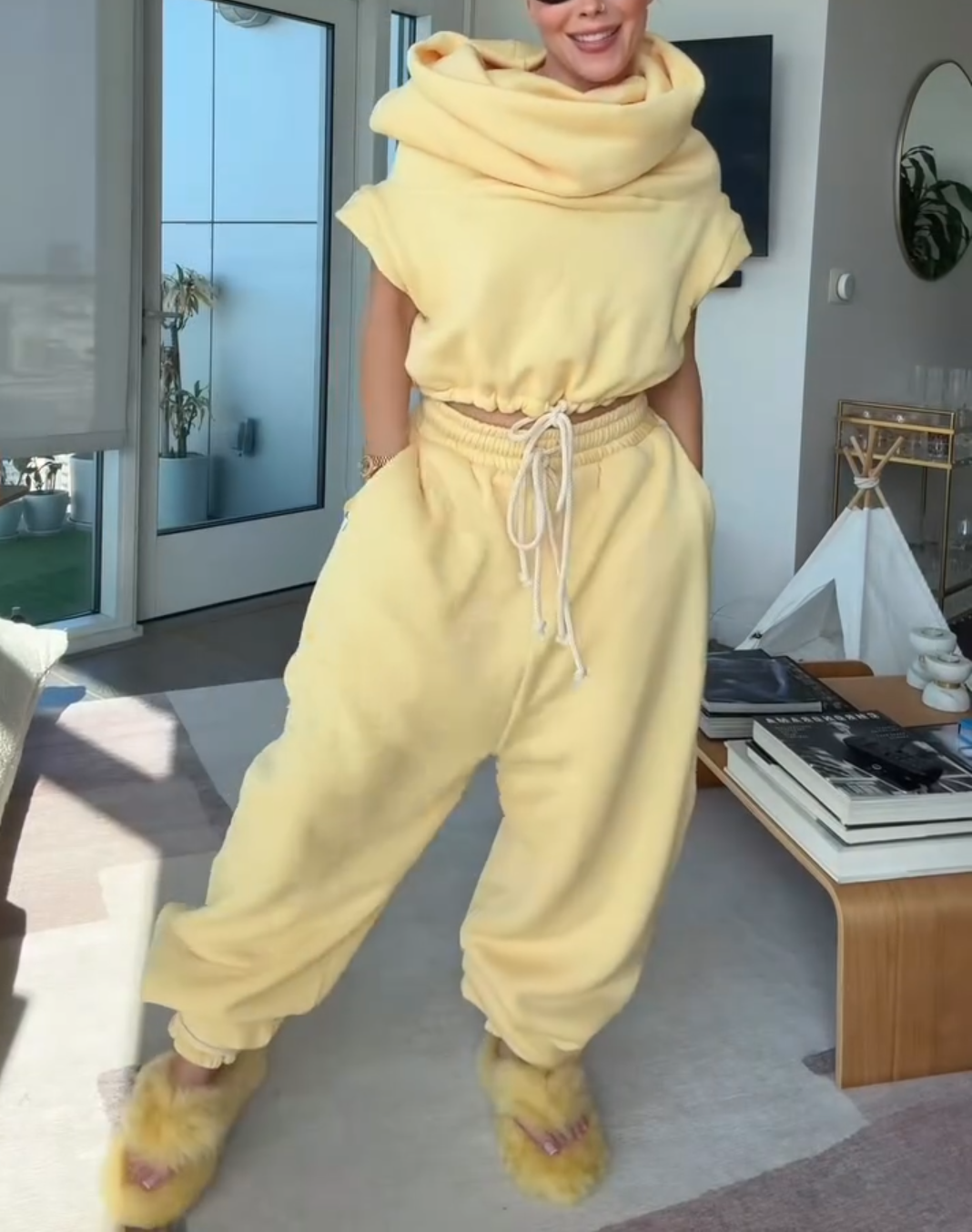 Ultra high cowl, cropped "hoodie" vest. Cotton drawstring at waist and capped sleeves. Fabric is doubled for a super cozy and luxe feel. Item is designed to fit loose and relaxed. Order your regular size. Models wear size XSMALL.